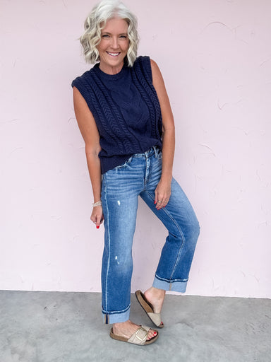 FINAL SALE: NO REFUNDS/ EXCHANGES The Navy Narrative Sweater Vest brings texture and timeless charm to your fall lineup. With its thick cable-k...
