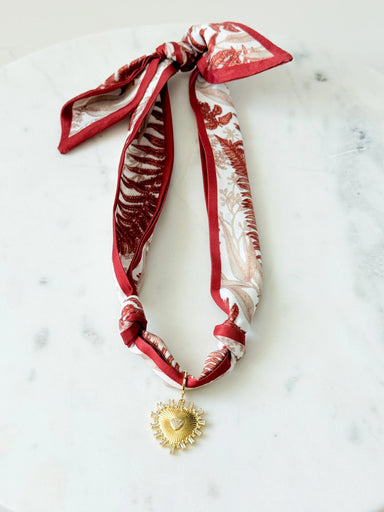 Wrap yourself in earthy elegance with this knotted scarf necklace. The rich rust-and-ivory print pairs beautifully with a gold heart charm framed i...
