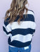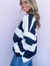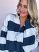 Upgrade your wardrobe with our Midnight Streak Sweater. This black and cream striped sweater is perfect for any occasion, thanks to its medium weight, chic collar and zipper neckline. With a drop shoulder design and raw edge seam detailing, this sweater effortlessly combines casual and chic styles.
