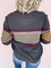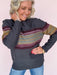 Stay cozy and stylish with the Off the Clock Sweater. This medium-weight knit in rich charcoal features an earthy multi-colored stripe pattern across the chest, adding a unique pop to your outfit. Designed with raw edge seams, it offers a modern, effortless look that pairs perfectly with both casual and elevated styles. Ideal for layering or wearing on its own, this sweater balances comfort with eye-catching detail to keep you comfortable and confident all day long.