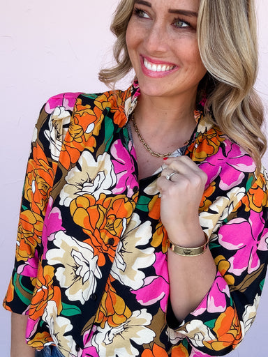 Make a statement with the Spellbound Floral Top, featuring a captivating floral print that blooms beautifully against a sleek black canvas. The ruf...