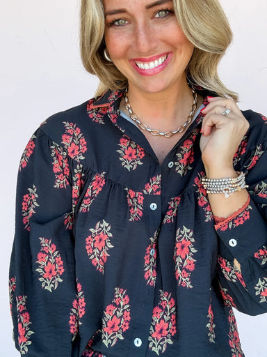 The Heartfelt Bloom Top features a soft floral print accented with warm contrast trim for a romantic yet wearable look. Designed with a gently ruff...