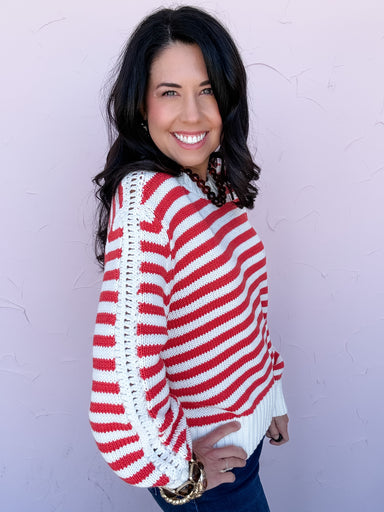 The Peppermint Stripe Pullover brings a playful, nostalgic vibe with its bold red accents and mocha colored micro-stripe pattern. The soft knit fee...