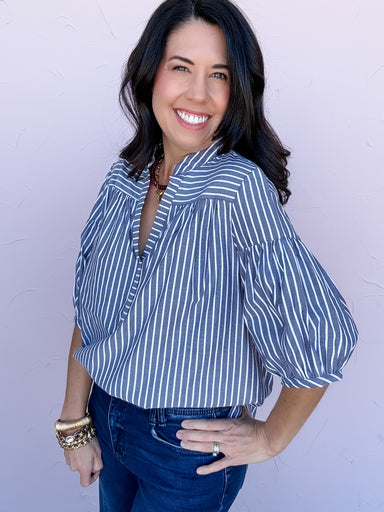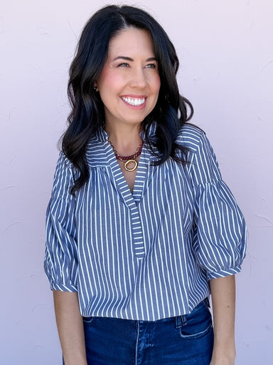 The Right Where You Are Top is an easy classic, gray top, with a flattering, everyday feel. The classic striped fabric features a split V-neckline ...