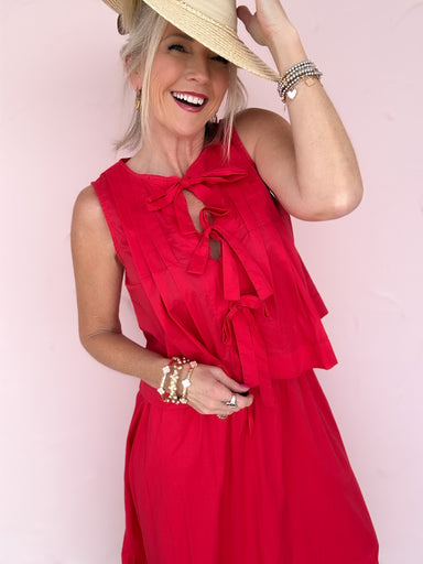 This poppy red sleeveless top is full of thoughtful details, from the soft pleating to the feminine tie-front neckline. Designed with a polished ye...