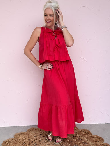 This poppy red skirt is an easy, feminine staple designed to move with you. Featuring a soft elastic waistband with a functional front tie ...
