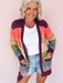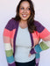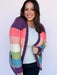 Brighten up chilly days with the Cold Front Cardigan — a playful pop of color that keeps you cozy and cheerful. This soft, open-front knit features bold, cheerful stripes in purple, coral, green, and blue, finished with a plush ribbed trim and handy front pockets. Whether you’re lounging at home or out for errands, this one brings the good vibes (and the warmth).